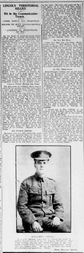 By the death Of Lance Corporal Albert Codling the 4th Lincoln territorials have lost yet another valued an promising non commissioned officer. ” I had him under notice for further promotion writes captain Tetley and it is a Distinct loss to his platoon that such an energetic and intelligent young soldier should have been fatally wounded so soon after his arrival in the trenches. Additional poignancy is added to the circumstances in view of the fact that the deceased Lance Corporal was a close comrade of the late Lance Corporal Leamy, who under like conditions lost his life a few weeks ago. Codling in fact was one of those who attended to the burial of Leamy and in a letter home he remarked at the time on the loss he and his comrades had sustained. It had been said by those in authority that the magnificent standard of efficiency attained by the British Army at present in France and Belgium is to a very large extent due to the unselfish and untiring efforts of the non-commissioned officers and Captain Tetley in his letters has more than once paid high tribute to the service of this important branch of our present army.