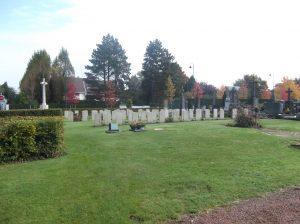 Bois-Grenier remained in British hands, though close to the front line, from October 1914 to April 1918, and the earliest British burials were made in the Communal Cemetery. There are now 121 Commonwealth burials of the 1914-18 war commemorated in this site. Of these, 8 are unidentified; three in Row K, were brought in after the Armistice, from the North side of the village. There are also 4 unidentified French burials here. The British plots cover an area of 431 square metres.