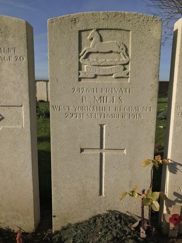 - In memory of Private B Mills, 242641, 1st/8th Bn., West Yorkshire Regiment (Prince of Wales’s Own) who died on 27 September 1918